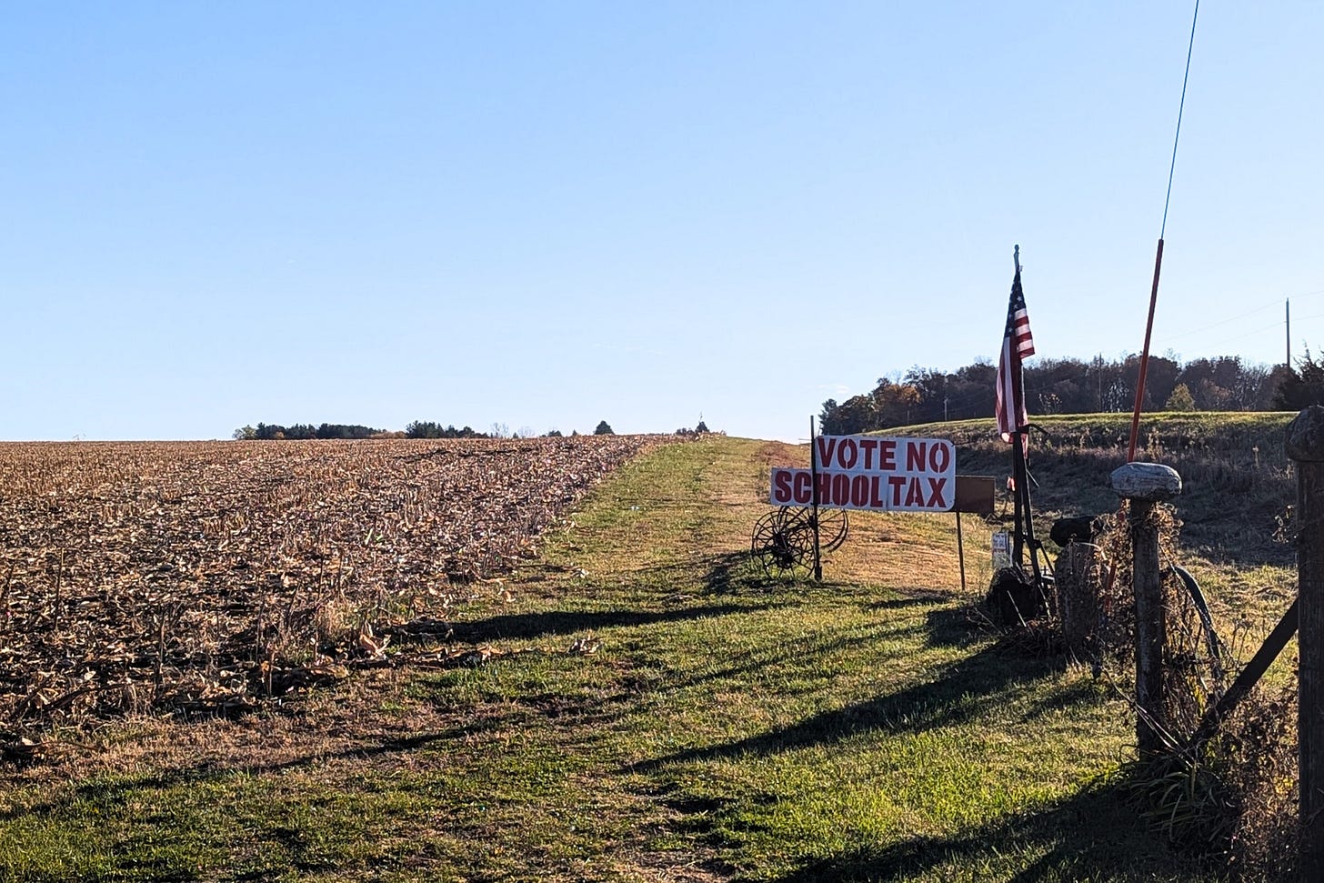 There’s a VOTE NO SCHOOL TAX sign still standing in front of a harvested cornfield on the edge of town. The crop’s been taken, the ground left bare. Just the sign and the stubble, one last monument to a season of taking.